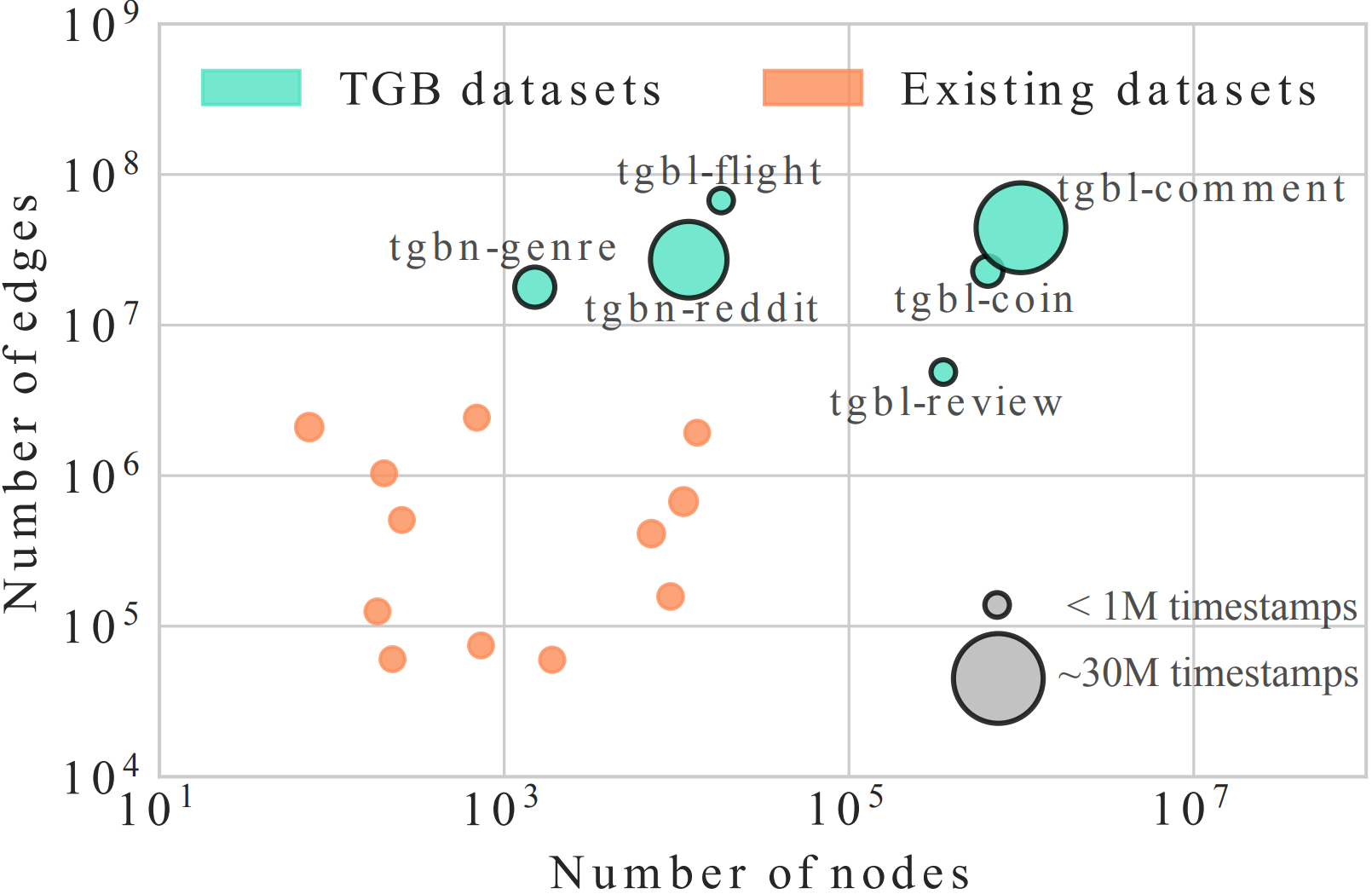 Rich domains: TGB datasets come from interaction networks, rating networks, trasanction networks, traffic networks, social networks, trade networks, political networks, knowledge networks and software networks.
